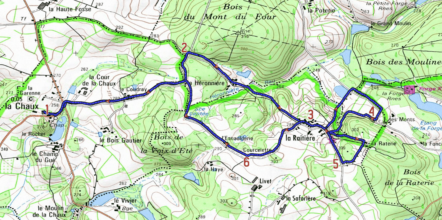 A la fin du chemin, tourner à gauche. - A la sortie de la Raitière (vous voyez plus loin la chapelle), emprunter la première route à gauche en direction de Rânes.