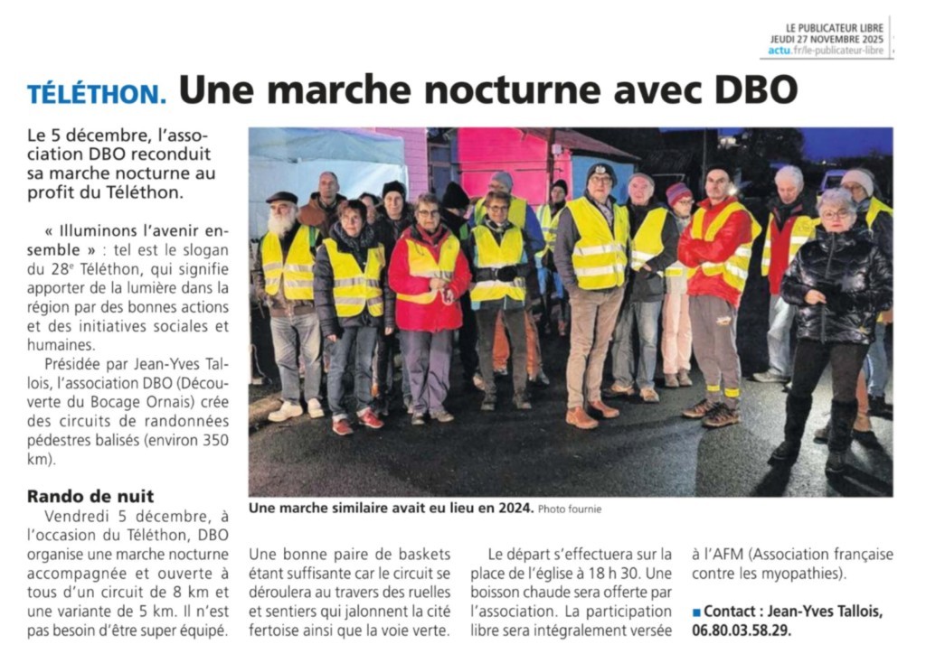 L’association D.B.O www.DecouverteBocageOrnais.fr de La Ferté-Macé organise vendredi 5 décembre, à l’occasion du Téléthon, une marche nocturne accompagnée et ouverte à tous d’un circuit de 8 km et une variante de 5 km.